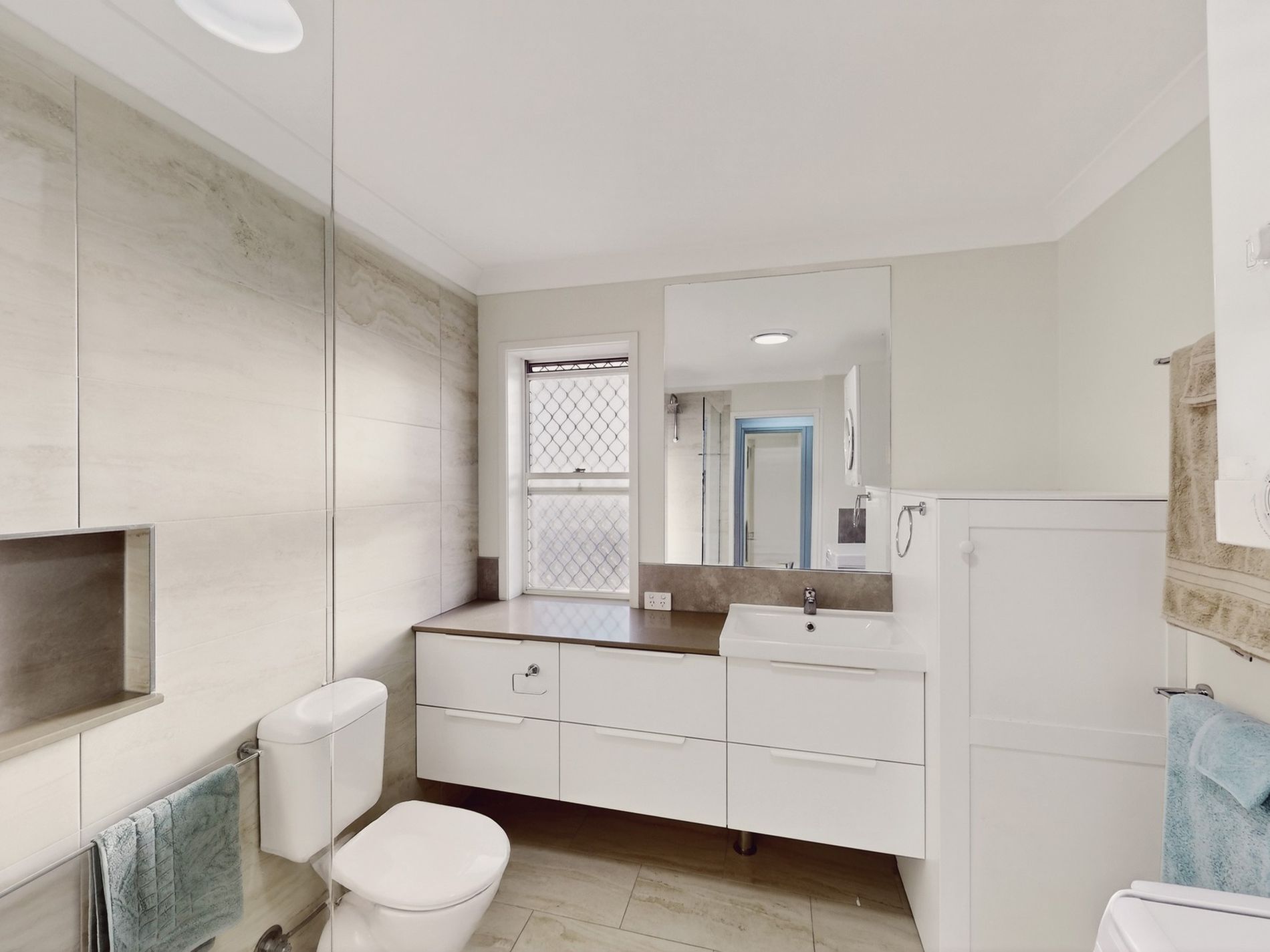* Renovated Bathroom with floor to ceiling tiles and combined laundry offering ample space and storage